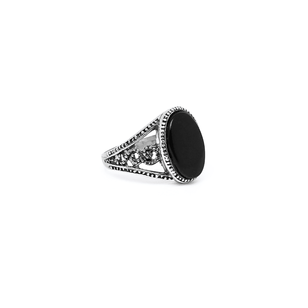 L’Anello Eco Onice Nero in Argento, con montatura vintage in Argento 925 e gemma Onice Nero da 10×14 mm, è un gioiello dallo stile raffinato e senza tempo.