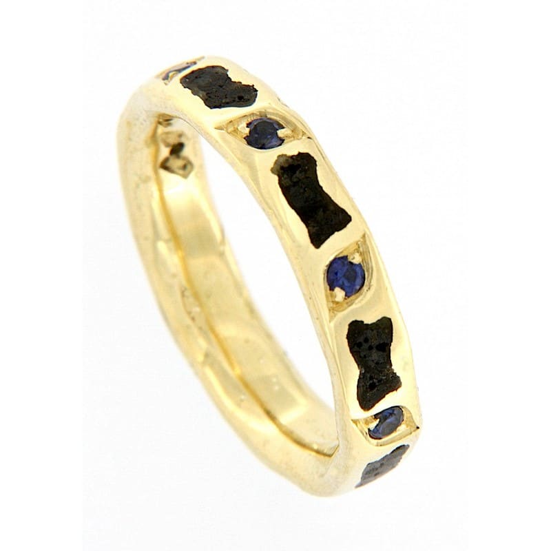 LโAnello Fede Eoliana Larga con Zaffiri in Oro รจ una creazione esclusiva, realizzata artigianalmente con Oro 18kt, lava vulcanica delle Isole Eolie e zaffiri da 24 punti di carato totali. Il contrasto tra la tonalitร intensa degli zaffiri e lโoscuritร naturale della lava rende questo anello un simbolo di bellezza e forza.