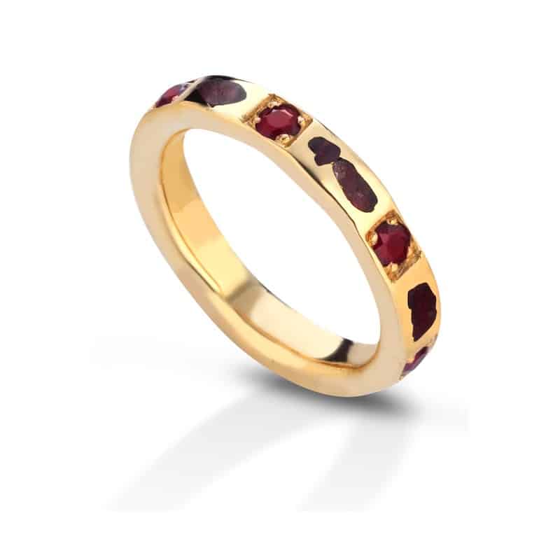 Anello Fede Eoliana Lusso in Oro 18kt con rubini e lava naturale delle Isole Eolie. Un design esclusivo e artigianale per un gioiello unico.