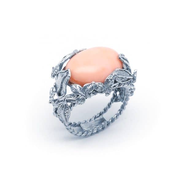 Anello in argento con cabochon di corallo rosa giapponese. Design ispirato alla ninfa Glauce, con dettagli floreali e doppio anello a corda. Eleganza unica e raffinata.
