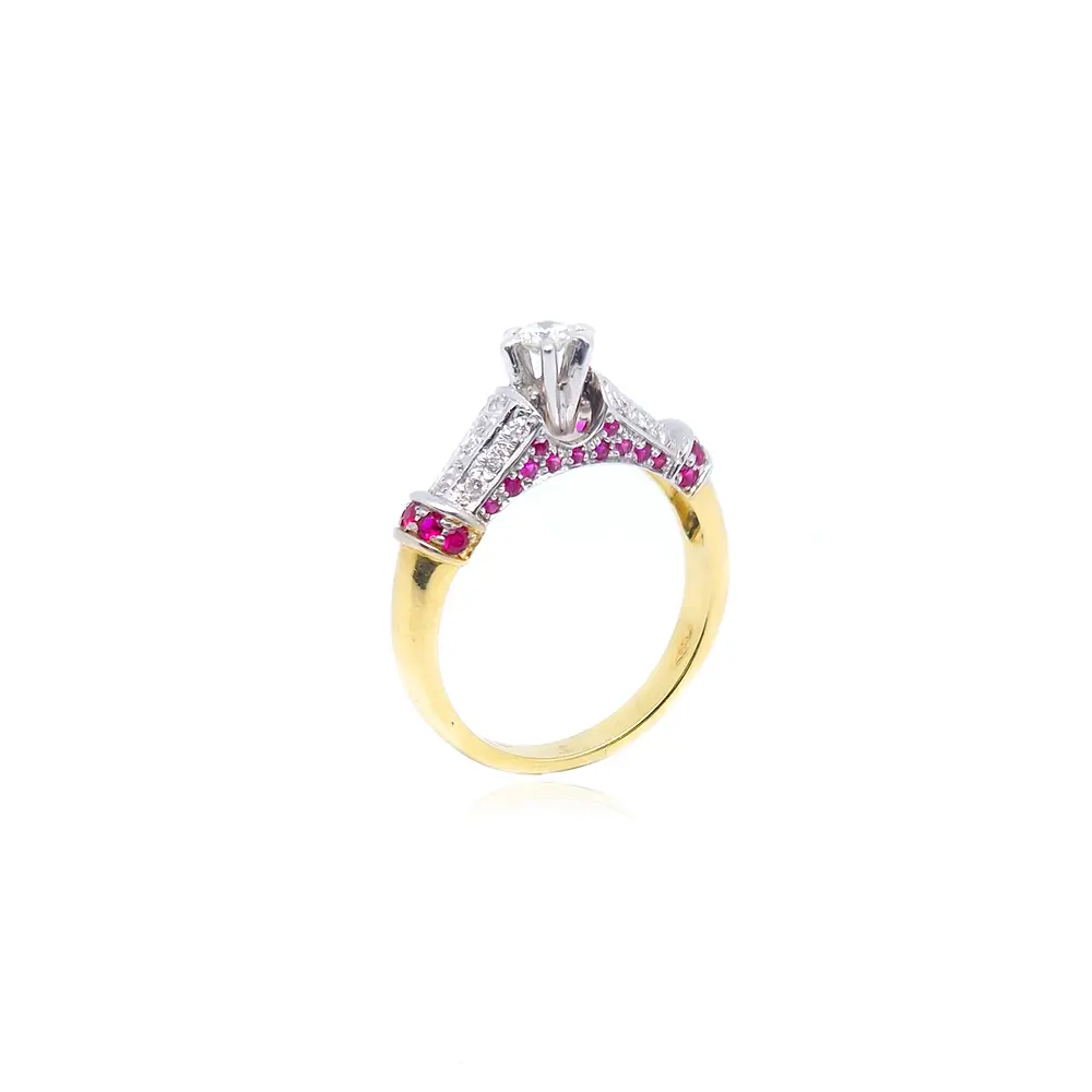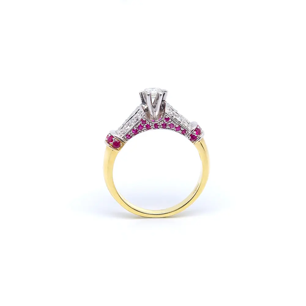 LโAnello Solitario Dafne con Diamanti e Rubini della Collezione Promesse del Mare รจ un gioiello, perfetto come anello di fidanzamento. Realizzato con una montatura in oro giallo per il gambo e oro bianco per la parte superiore. Questo anello รจ un equilibrio raffinato tra stile classico e design moderno. Al centro, un brillante diamante da 0.15 ct taglio VS, colore G, รจ sorretto da una montatura a sei griffe.