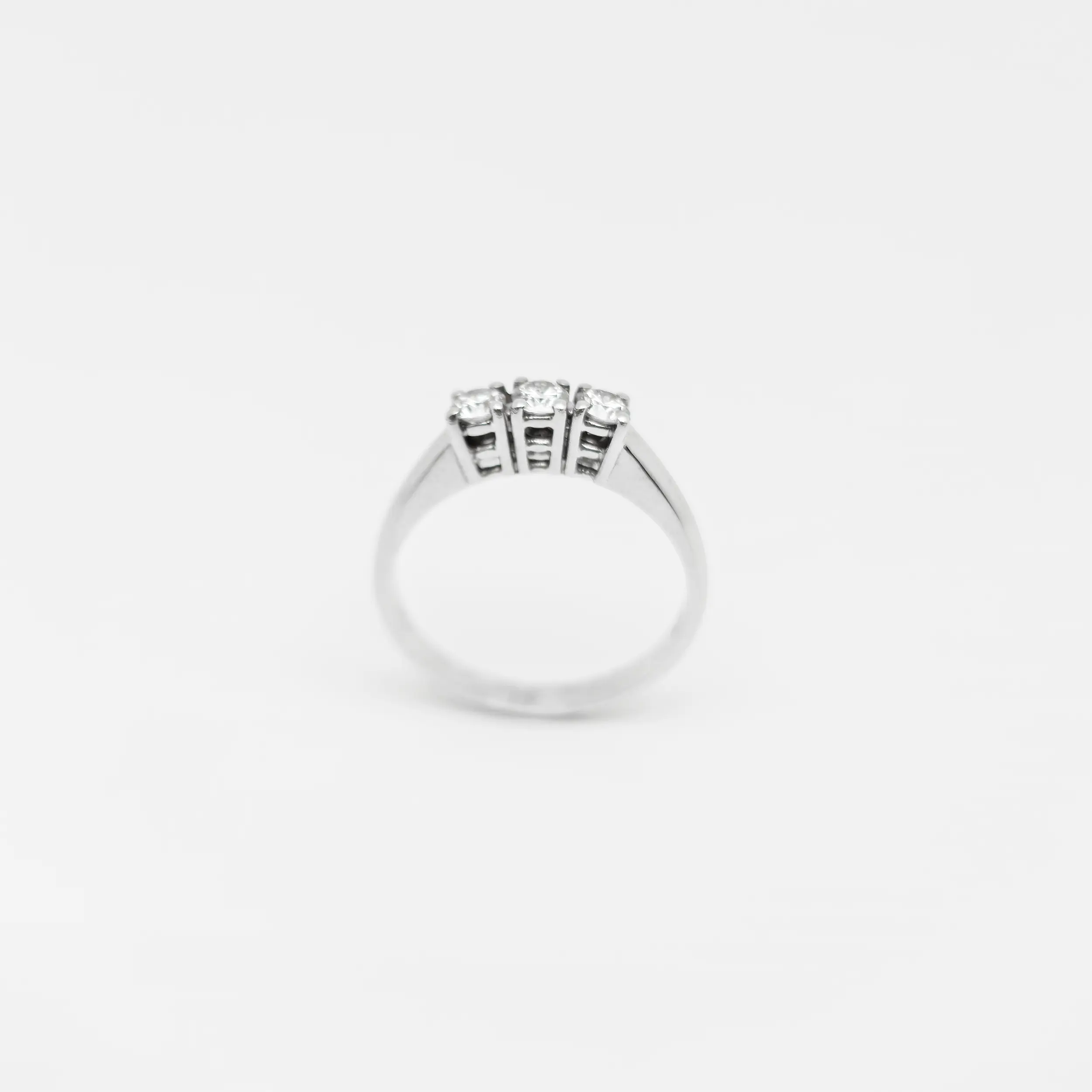 Anello Trilogy in Oro Bianco 18kt con 3 diamanti naturali (0,36 ct totali, Colore G, Purezza VS2). Eleganza e significato per ogni occasione speciale.