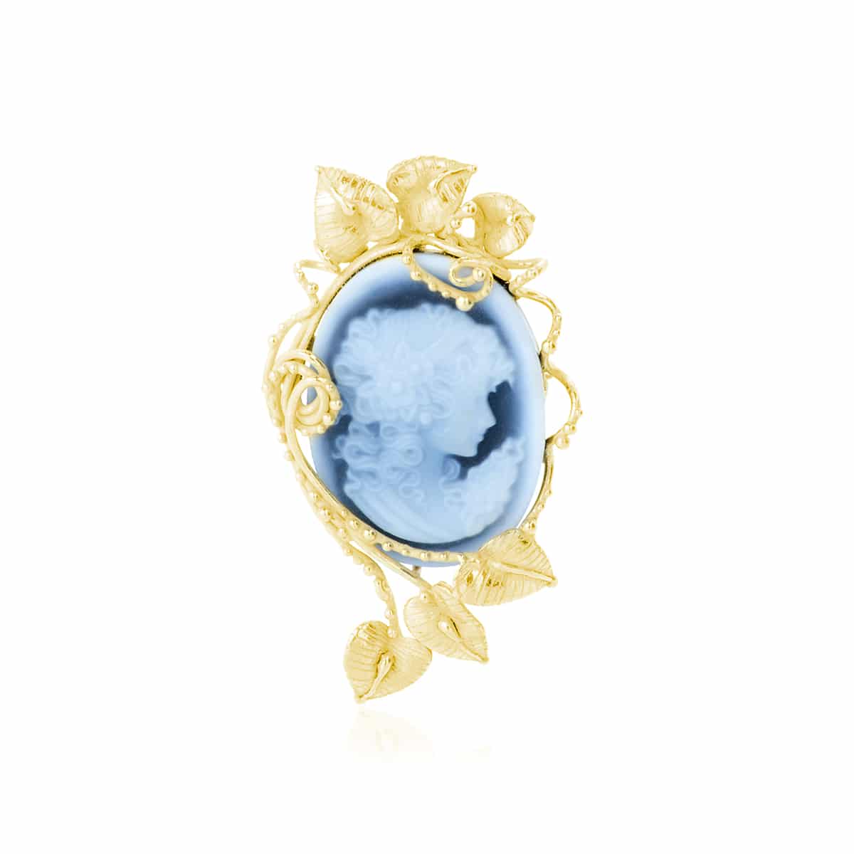 Il Ciondolo con Cameo in Agata Blu in Oro, con volto di donna intagliato, rami e foglie in oro 18 kt e spilla integrata, celebra eleganza e versatilità.
