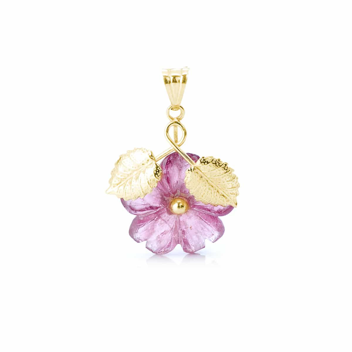 Accuratamente ideato e creato a mano dai nostri maestri artigiani, il Ciondolo raffigura un Fiore inciso nella caratteristica gemma Tormalina montata in prezioso Oro 18 kt. Il gioiello è reso particolarmente originale dalla pregiata gemma in colore Viola e dalla graziosa decorazione di due piccole Foglie che impreziosiscono il delicato Fiore. Il Ciondolo Fiore Tormalina in Oro racchiude in sé l’incanto della natura floreale esprimendo la classe e la maestosità di un prezioso gioiello.