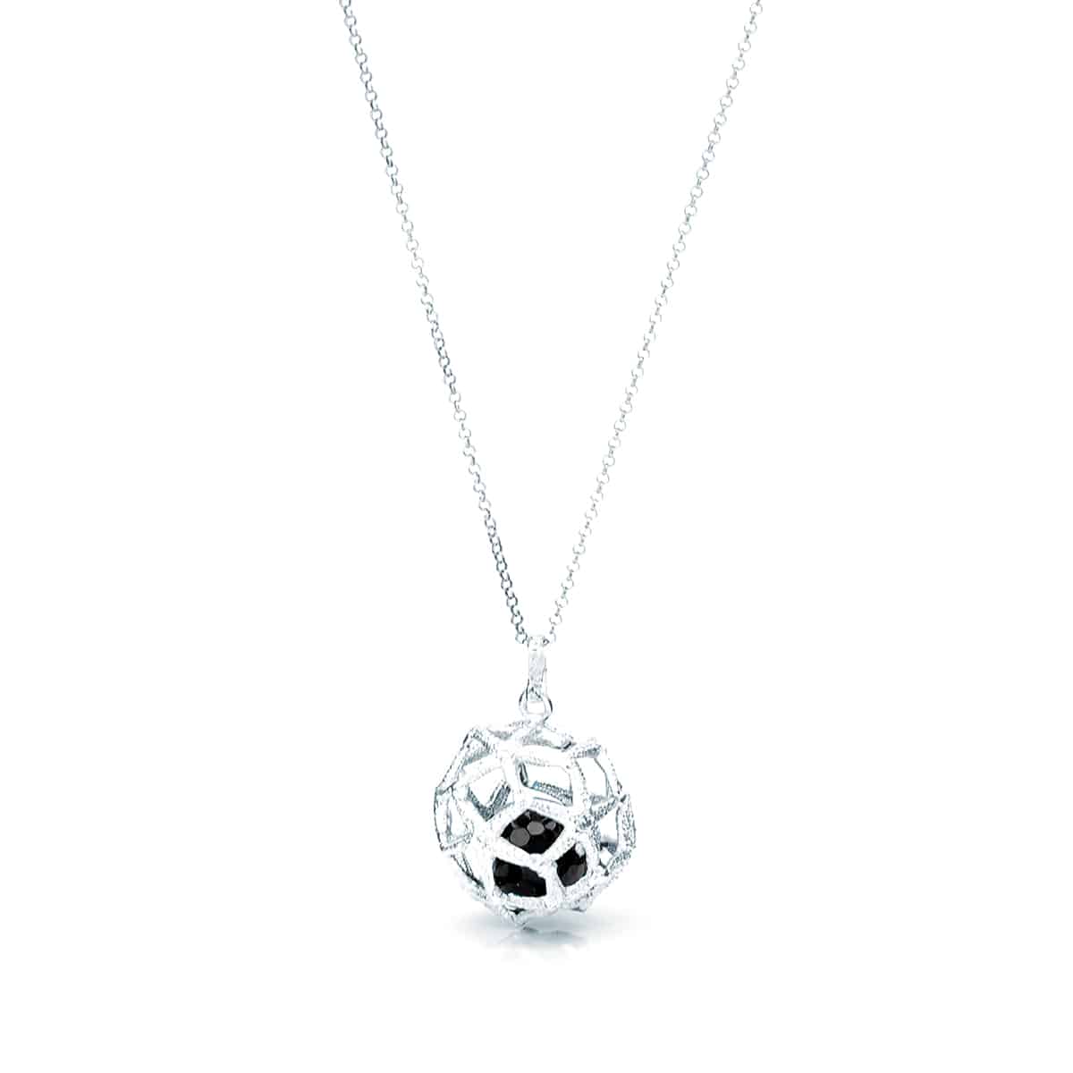 Questo ciondolo “chiama Angeli” è realizzato con una maglia di Stelle Circe unite a proteggere la boule di Onice Nero sfaccettato che con il suo movimento vi regalerà un dolce e delicato tintinnio.