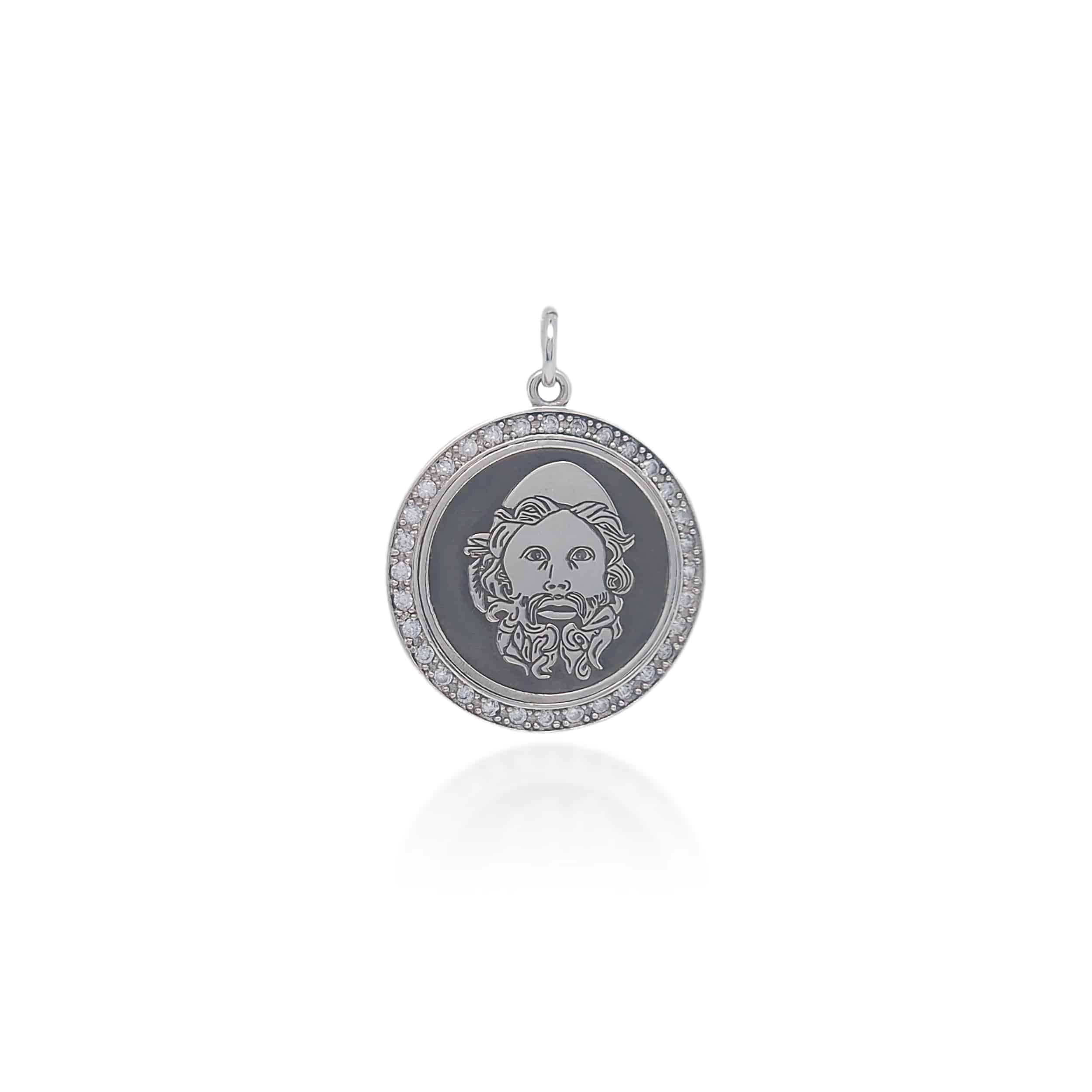 Il Ciondolo Ulisse Pavé mostra il volto del famoso personaggio omerico nel momento in cui per la prima volta nella sua vita posa gli occhi su Circe. Un’espressione enigmatica di sorpresa che cela le mille emozioni provate dal leggendario navigatore dei mari in quel magico momento.