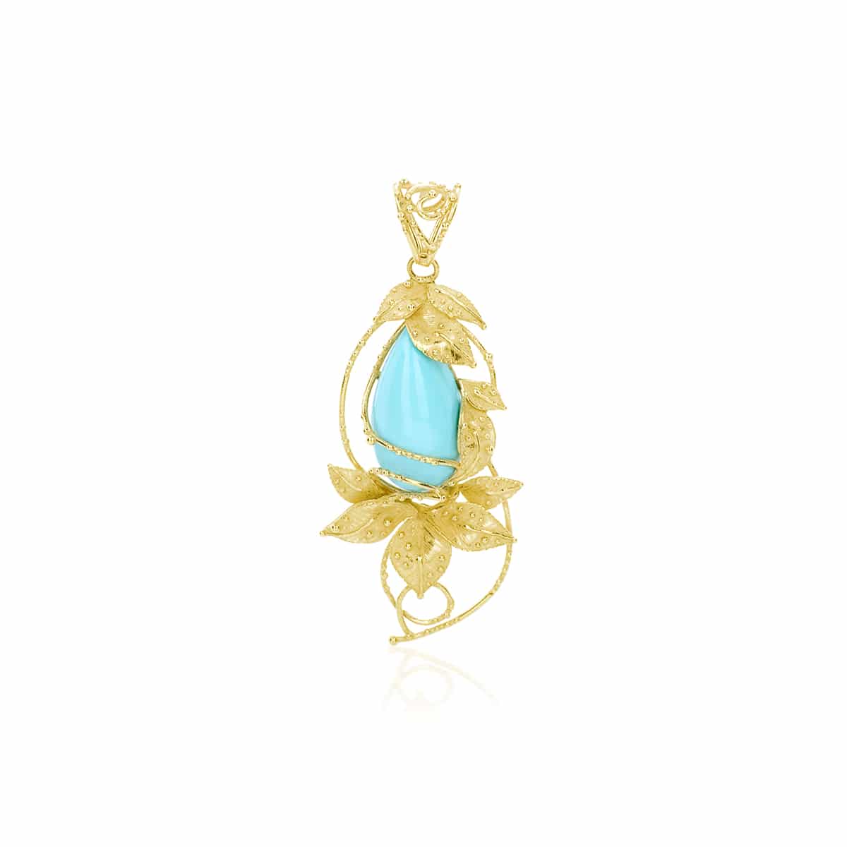 Ciondolo Unique Cabochon a Goccia di Turchese Naturale con Rami e Foglie in Oro 18 kt