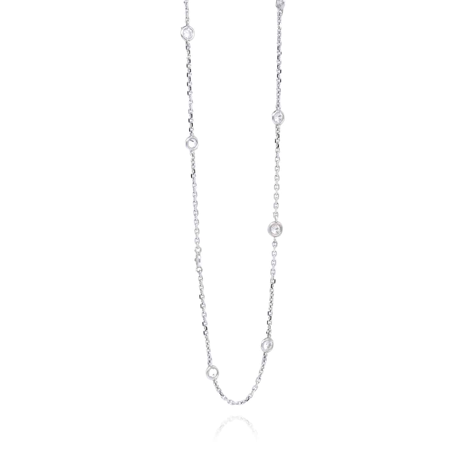 Questa collana è interamente realizzata in Oro Bianco 18kt, un materiale che garantisce lucentezza e durabilità. Le gemme di cubic zirconia, accuratamente incastonate lungo la catena, aggiungono un tocco di luce che esalta l’eleganza del design minimalista.