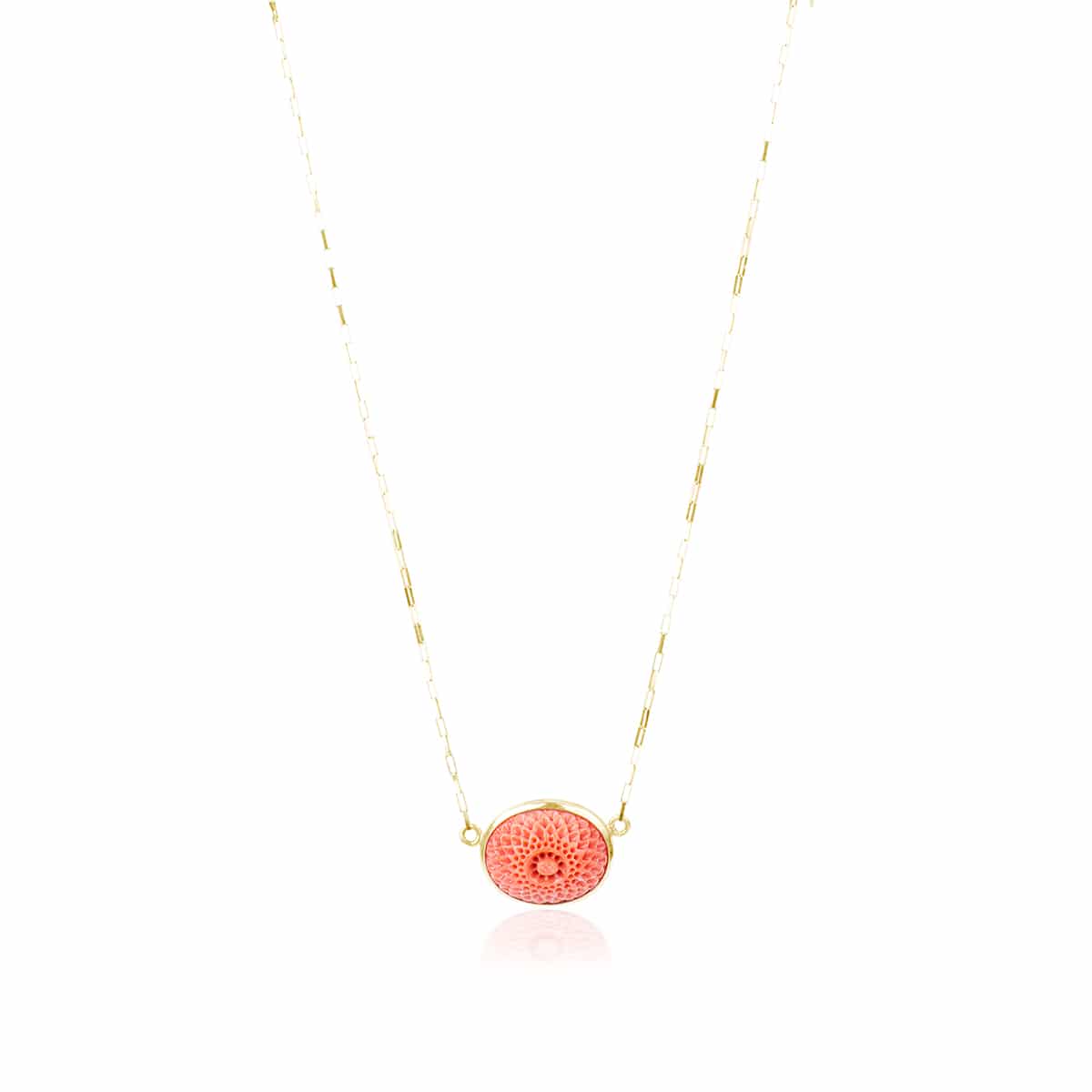 La Collana è realizzata in Oro 18 Kt e ha come centrale un Cabochon in Corallo Rosso del Mediterraneo. L’incisione floreale del Cabochon lo rende un vero esempio di prodotto interamente realizzato a mano, impreziosito da materiali eslusivi come l’Oro e il Corallo Rosso proveniente dalla Sardegna. Risulterà l’ideale per chi ama indossare solo Gioielli unici e rigorasamente originali.