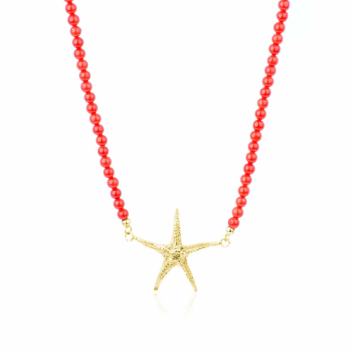 La Collana fa parte della Collezione Stelle del Circeo è realizzata con Corallo Rosso del Mediterraneo e una stella marina in Oro. Perfetta per ogni occasione, aggiunge eleganza e raffinatezza al tuo look.