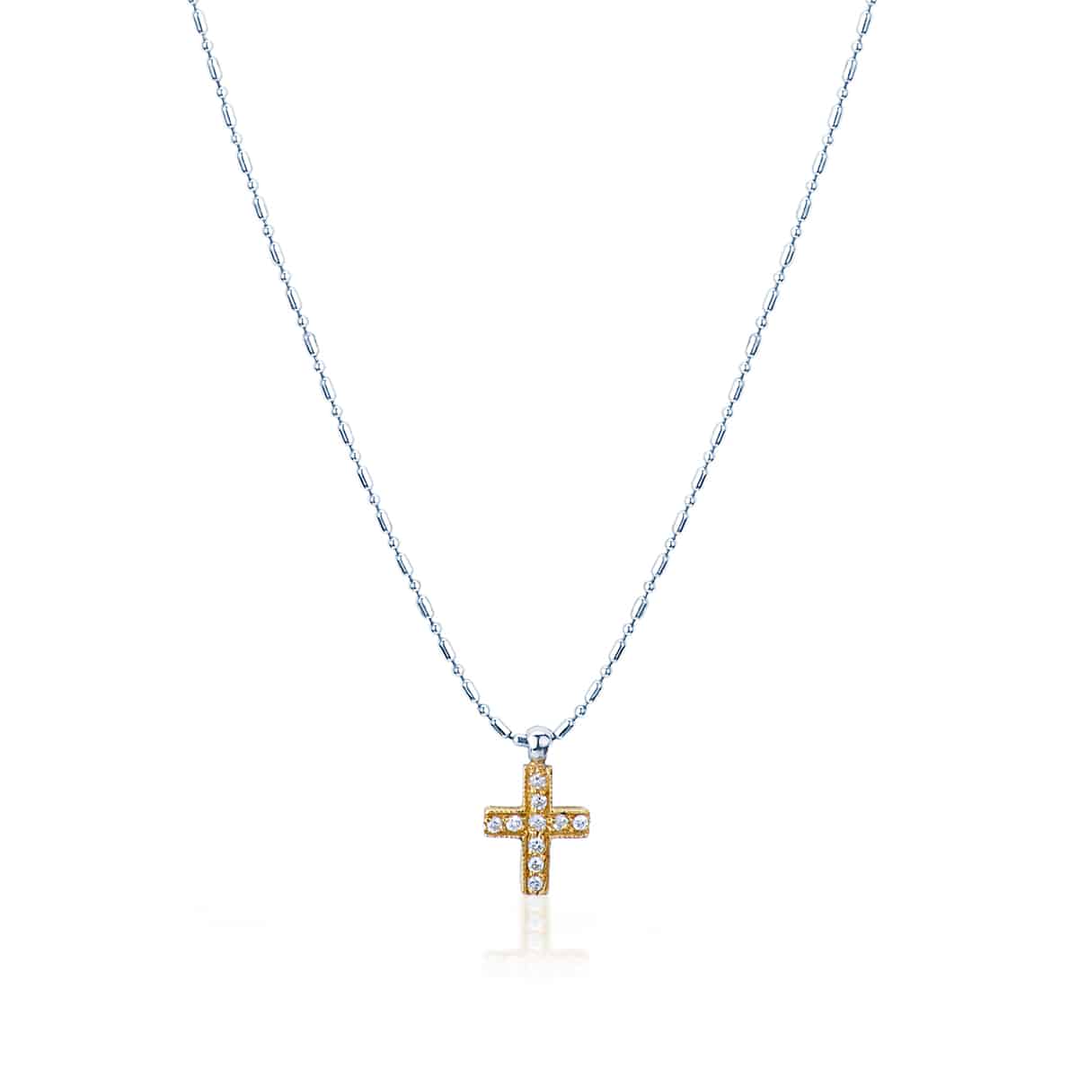 La Collana è realizzata interamente in oro Oro 18 Kt e impreziosita da Diamanti al centro di un Ciondolo a forma di Croce. L’Oro è presente in una doppia veste cromatica, quella gialla, classica e tradizionale e quella bianca, innovativa ed originale. La Collana Croce in Oro 18 Kt e Diamanti è un piccolo gioiello dal significato profondo e dall’indiscussa raffinatezza.