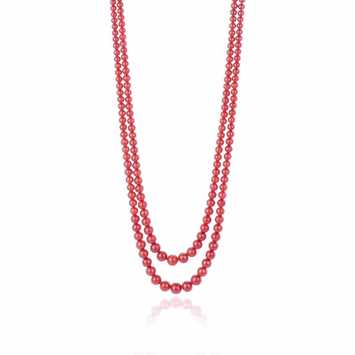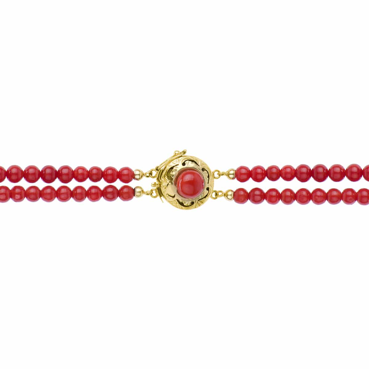 La Collana si compone di due fili con pallini di Corallo Rosso Sardo, dal calibro a gradazione dai 4 ai 6 mm, una chiusura Multifilo in Oro 18 Kt e Cabochon. E’ il Gioiello ideale per impreziosire il collo di una donna che cura il suo stile con materiali raffinati ed eleganti.