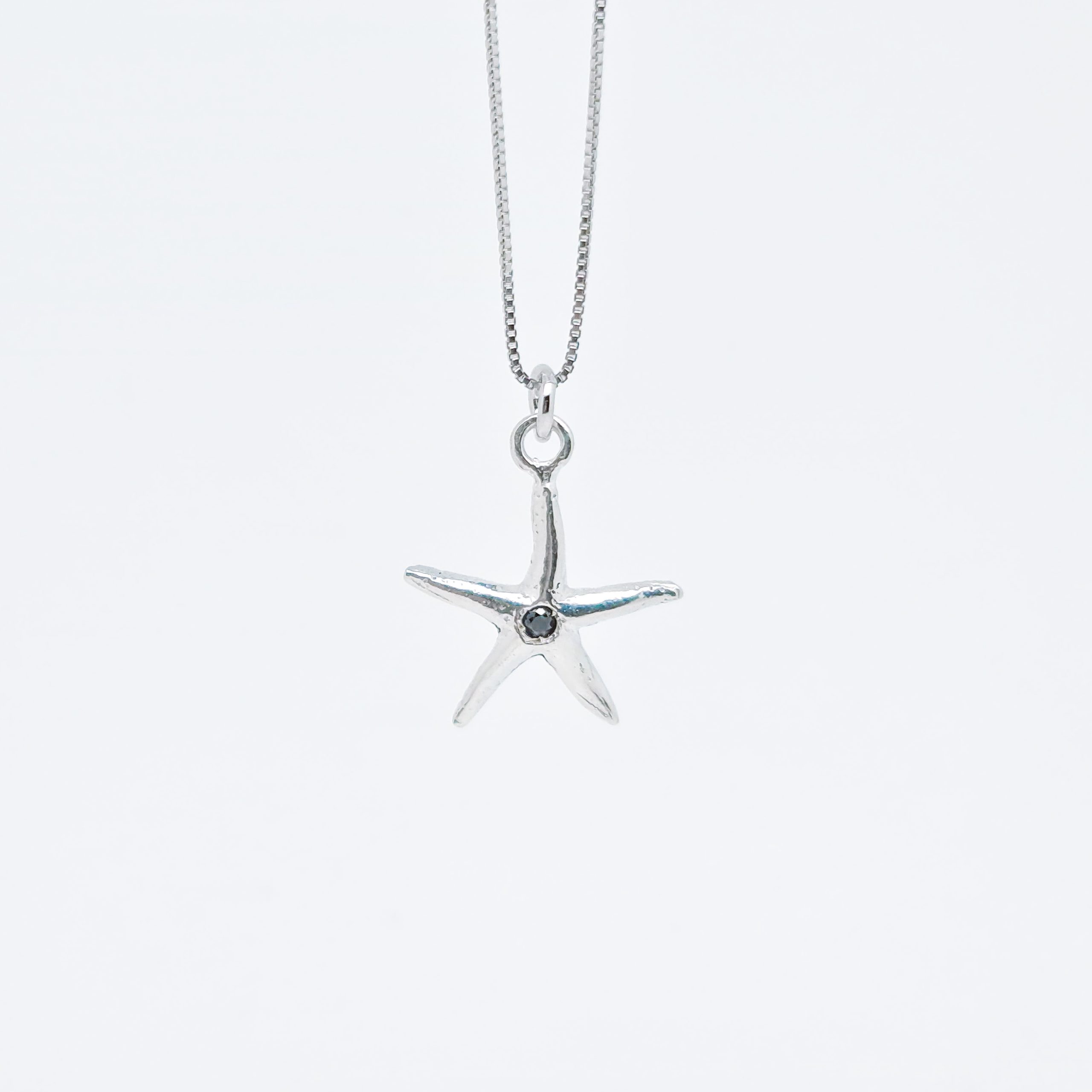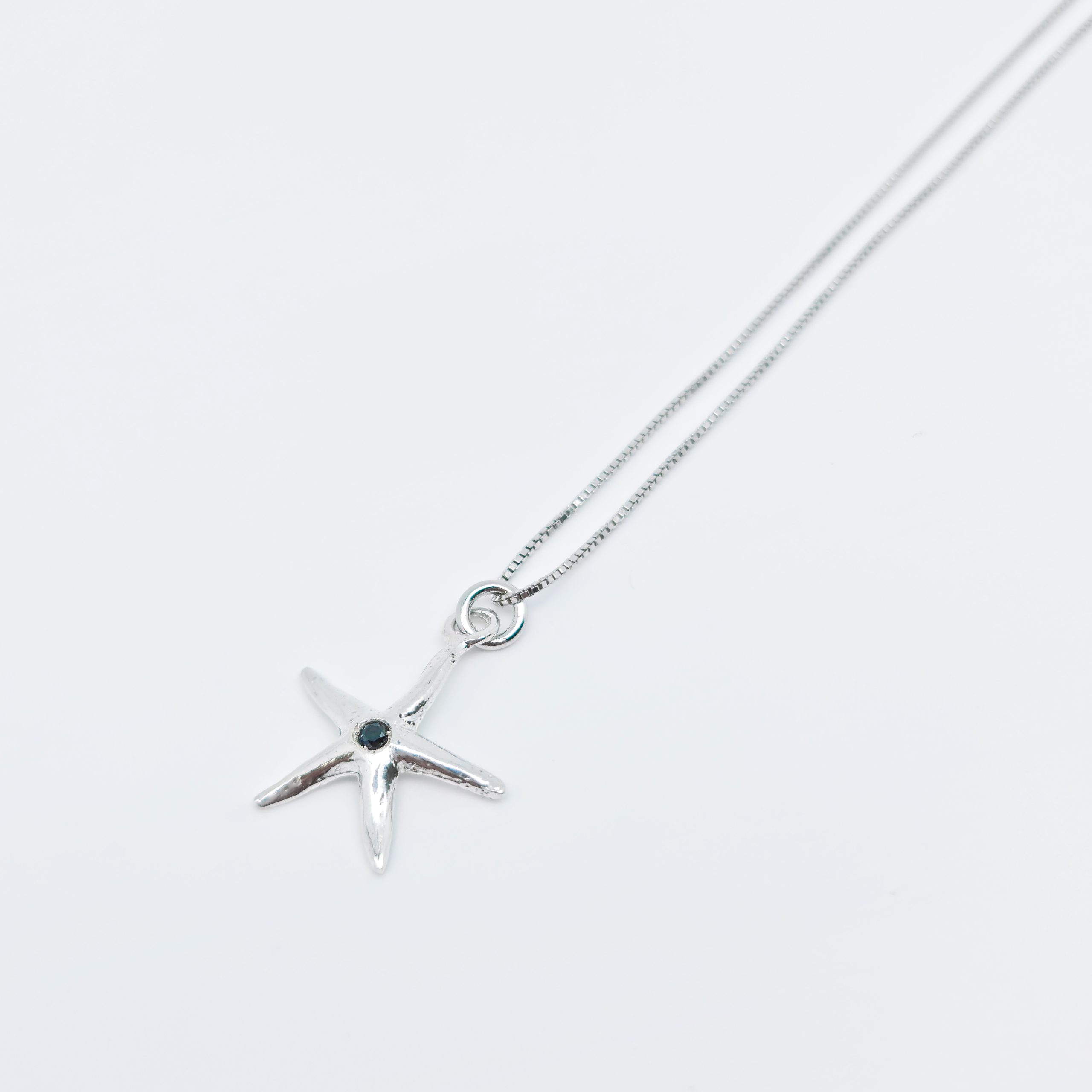 La Collana Stella Seta Diamante Nero della Collezione Stelle del Circeo รจ un pezzo unico in argento con una stella marina di 16 mm. Incastonata con un diamante, rappresenta un gioiello raffinato e simbolico, perfetto per chi desidera eleganza e unicitร .