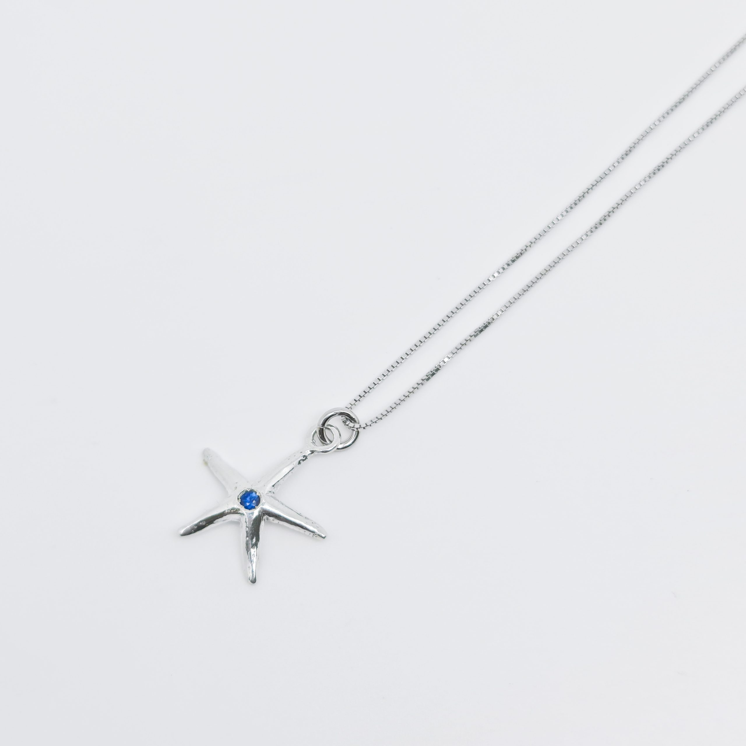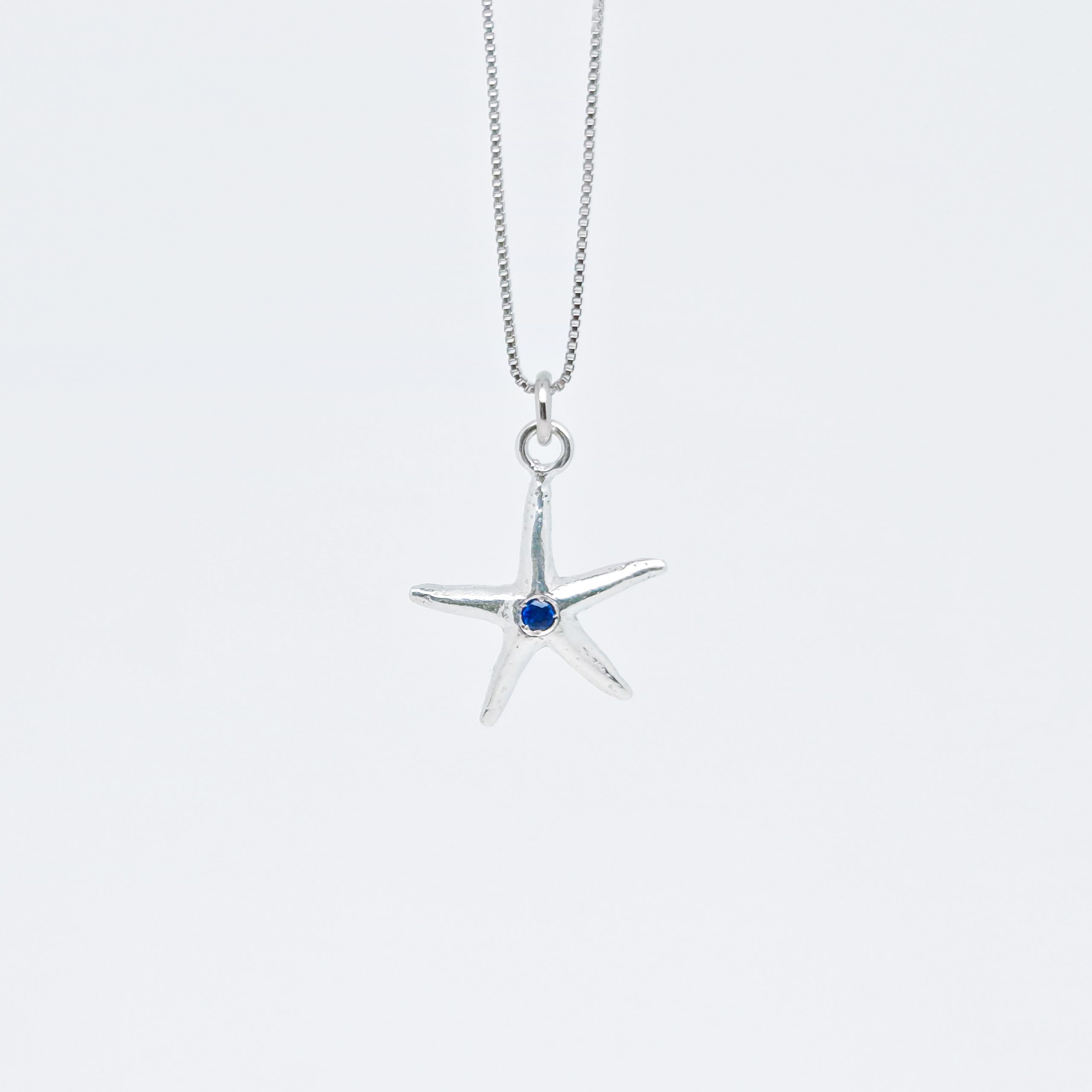 La Collana Stella Marina Seta Zaffiro della Collezione Stelle del Circeo รจ un pezzo unico in argento con una stella marina di 16 mm. Incastonata con uno Zaffiro, rappresenta un gioiello raffinato e simbolico, perfetto per chi desidera eleganza e unicitร .