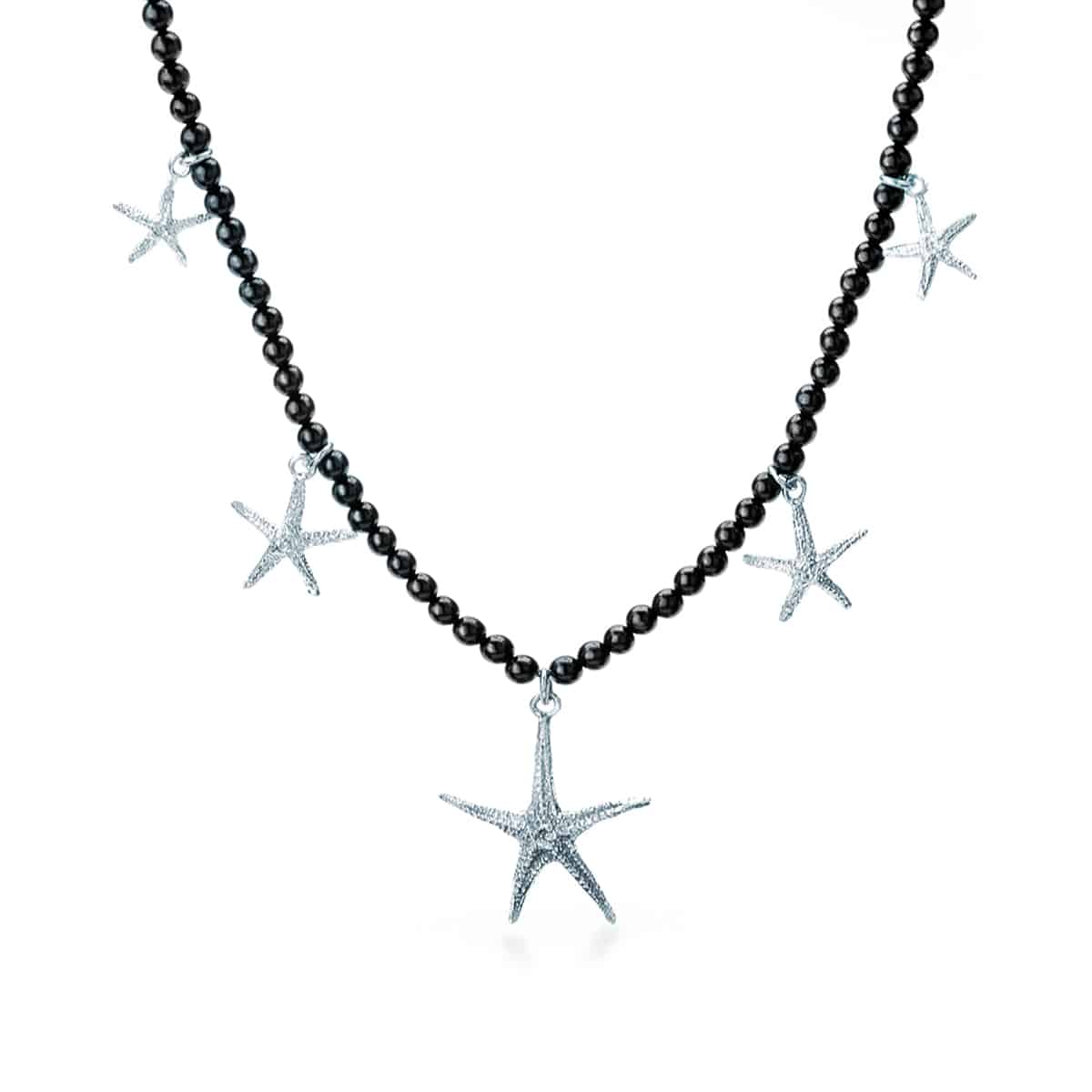 La Collana è realizzata con un filo a pallini dal calibro di 4 mm di Corallo Nero Gorgoniano su cui sono montate 5 Stelle Marine Circe di diversa grandezza in Argento. L’accessorio è un omaggio che I Gioielli del Mare hanno voluto rendere alla Maga Circe e alla bellezza della terra ancora sotto il suo incantesimo, il Circeo. La Collna Corallo Nero e Cinque Stelle Marine Circe è un esempio di come l’Artigianato può incarnare i valori e la storia di Mito trasformandoli in Gioielli unici.