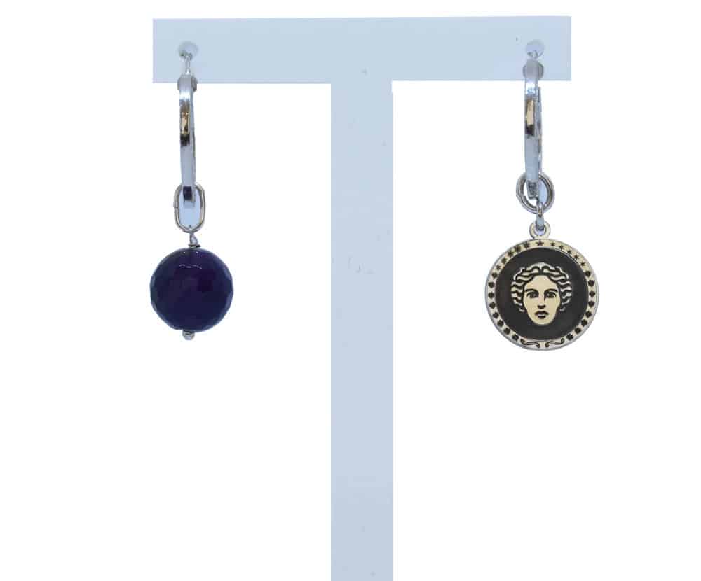 Orecchini argento con Volto della Maga Circe pendente, abbinato con pietra di onice sfaccettato pendente.