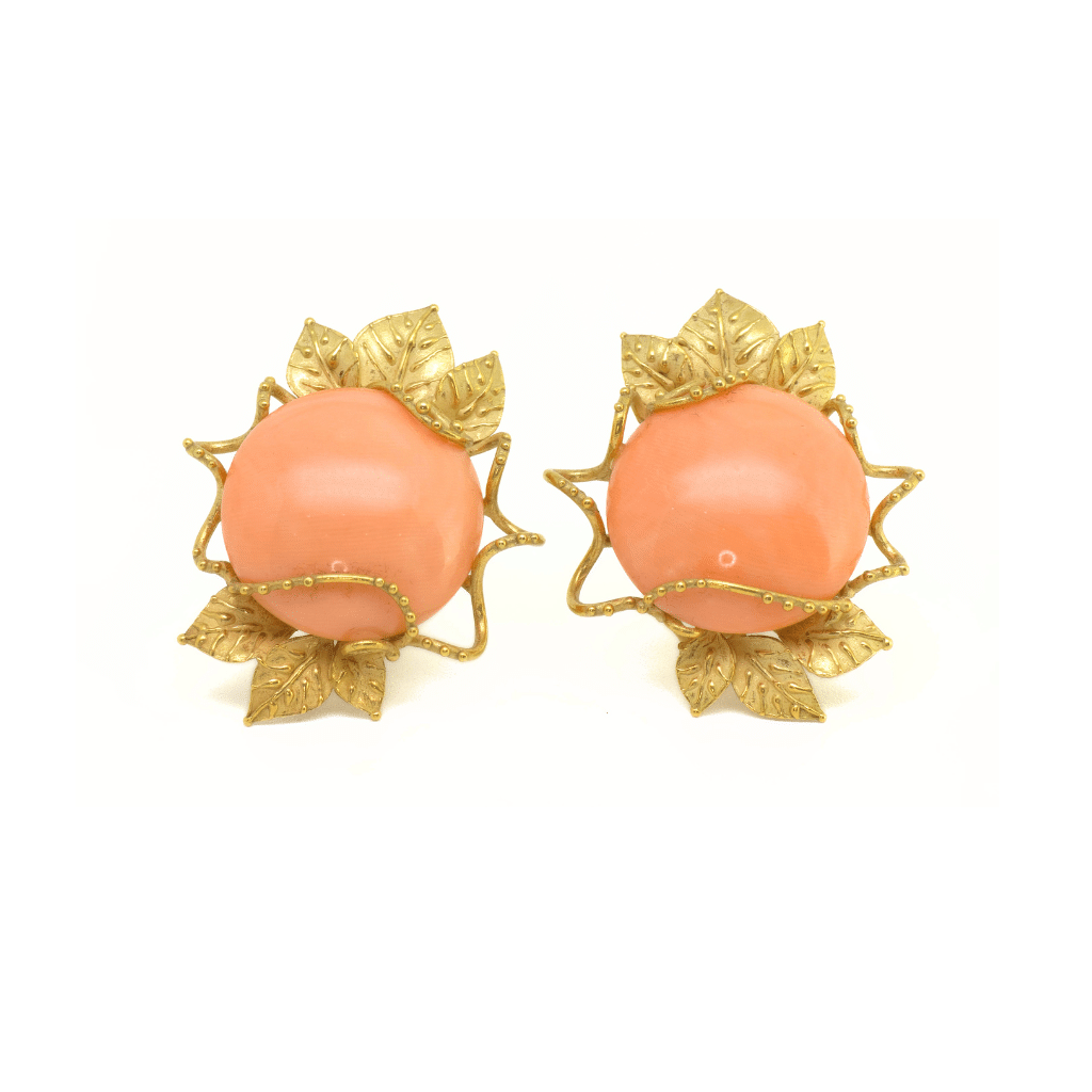 Gli Orecchini Corallo Rosa in Oro Daphne, con Corallo Rosa Corallium Elatius da 20 mm e dettagli in Oro 18 kt lavorati a cera persa, sono un omaggio al mito di Daphne e alla bellezza naturale.