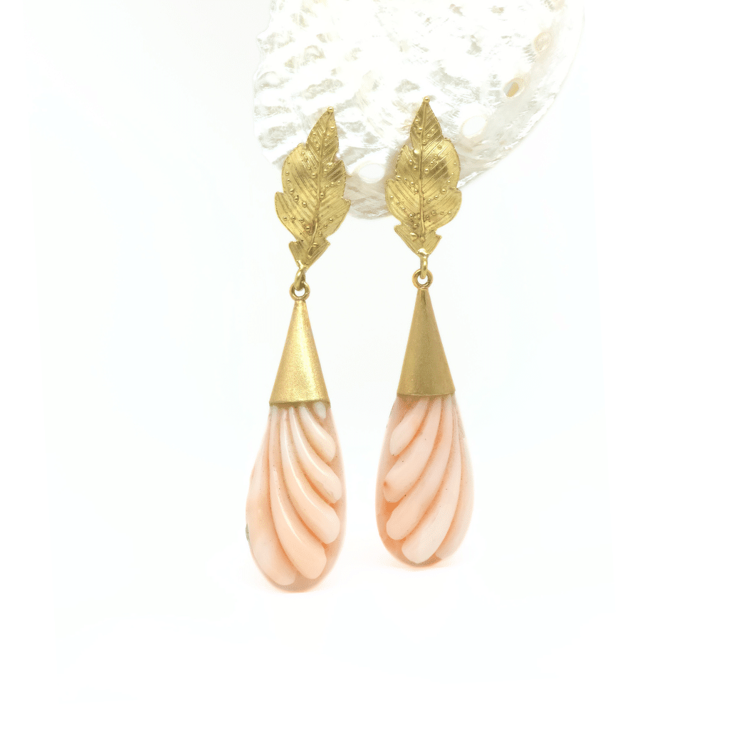 Gli Orecchini Corallo Rosa in Oro Dryope, con goccia incisa di Corallium Secundum e dettagli in oro 18 kt, celebrano la bellezza naturale e la grazia del mito di Dryope.